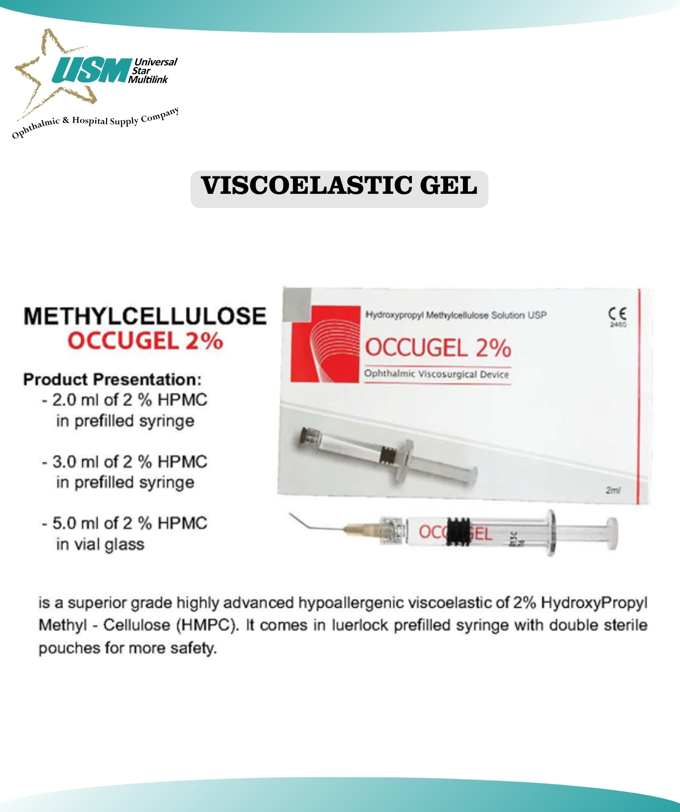 The Ophthalmic Viscosurgical Device (DVD) - Hydroxy Propyl Methyl Cellulose (HPMC) Ophthalmic Solution - is a sterile, isotonic, viscoelastic solution of highly purified, non inflammatory Hydroxy Propyl Methyl Cellulose (HPMC) with a high molecular weight. The solution is prepared by dissolving HPMC powder in aqueous, isotonic solution. The molecular weight of the material is Min 80000 dalton. The pH range of the solution is maintained at 6.8-7.6.