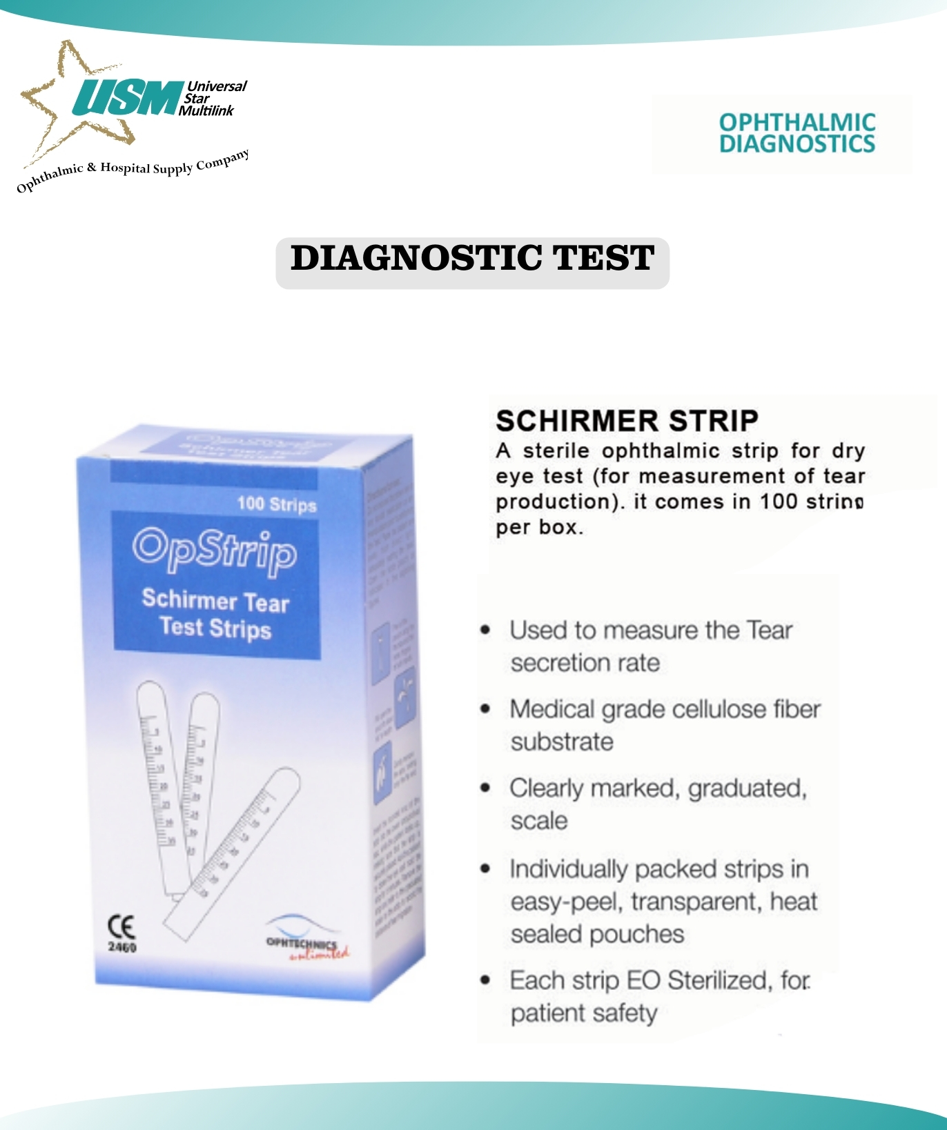 The Schirmer Tear Test is a filter paper with a measuring scale (0-30 mm) printed on it. Each strip is supplied sterile , packed in a dry heat sealed pouch. Multiple such strips are packed in one box.